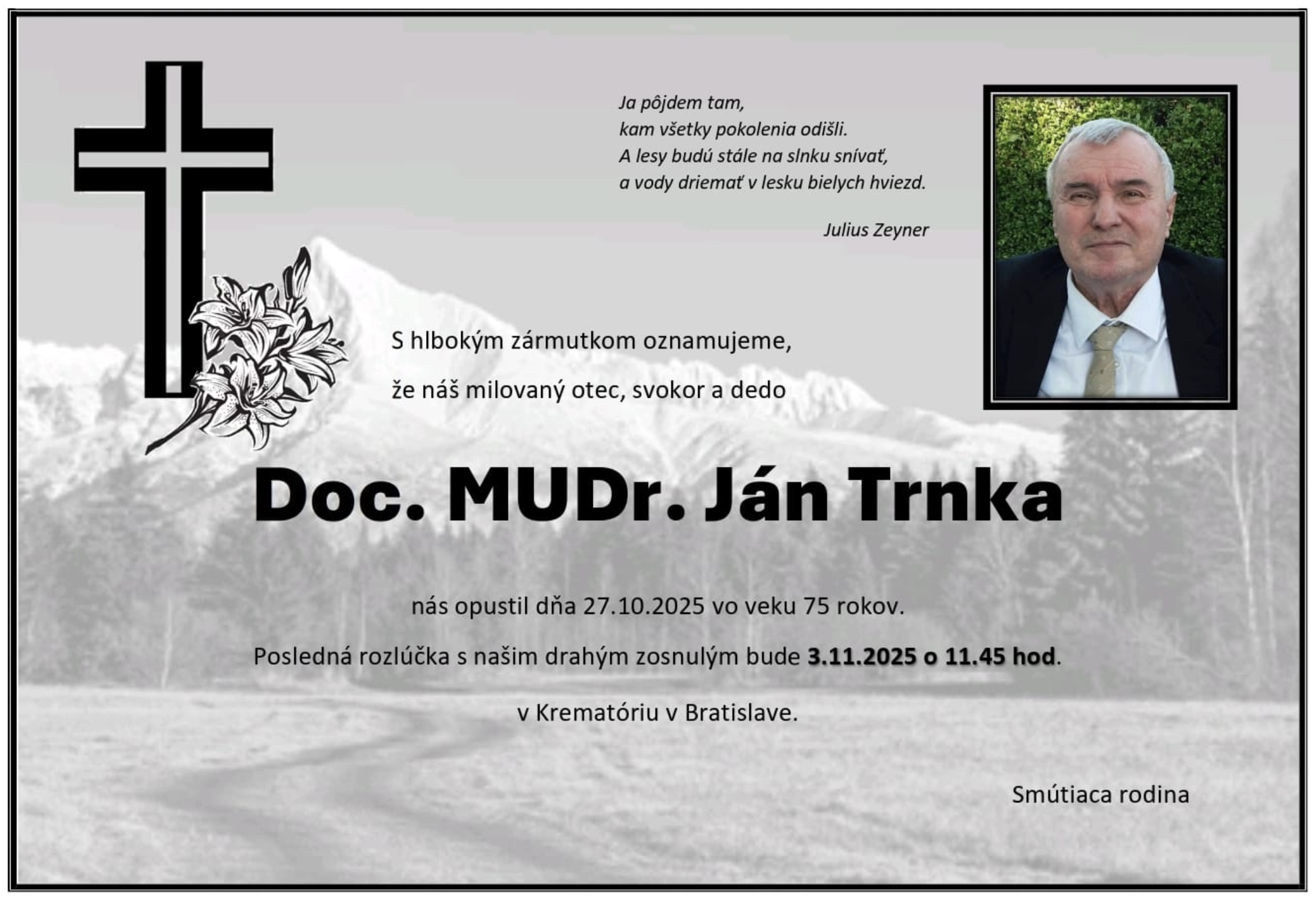 S hlubokým zármutkem oznamujeme, že dne 27. října 2025 ve věku 75 let zemřel doc. MUDr. Ján Trnka, CSc., dlouholetý přednosta Kliniky dětské chirurgie LF UK a NÚDCH v Bratislavě.